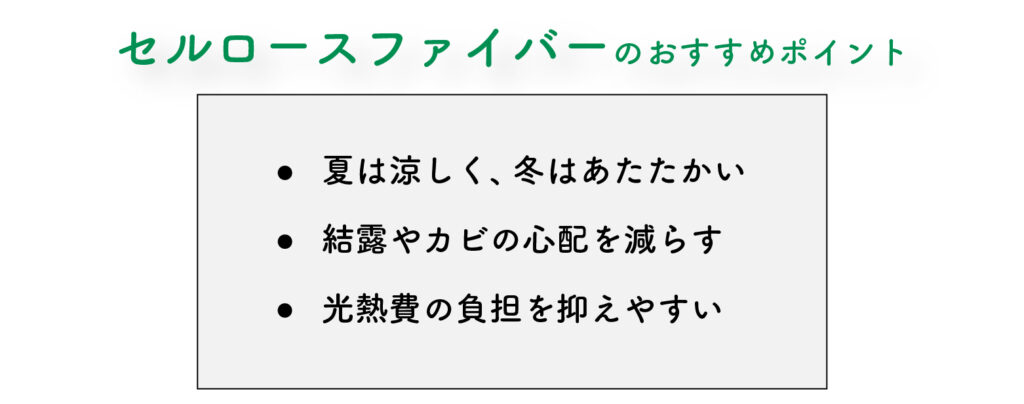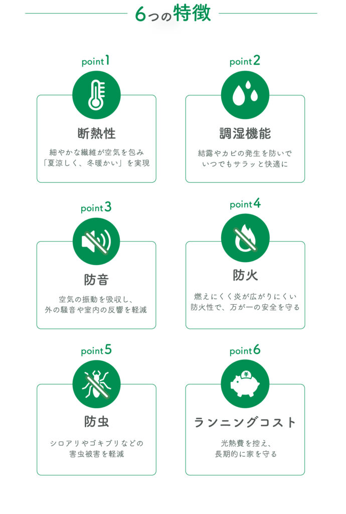 さらに、断熱だけでなく「調湿・防音・防火・防虫」といった性能も兼ね備えています。