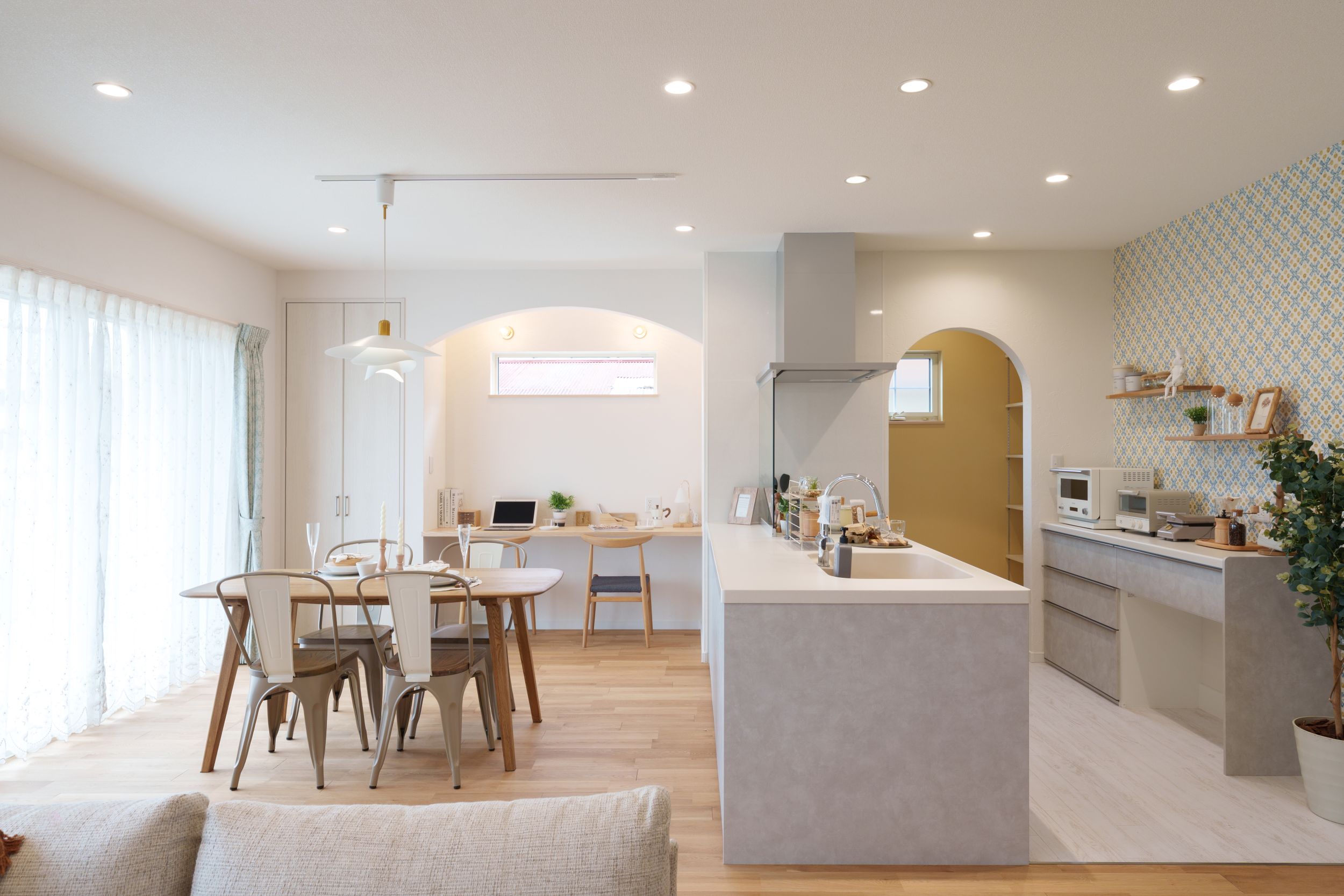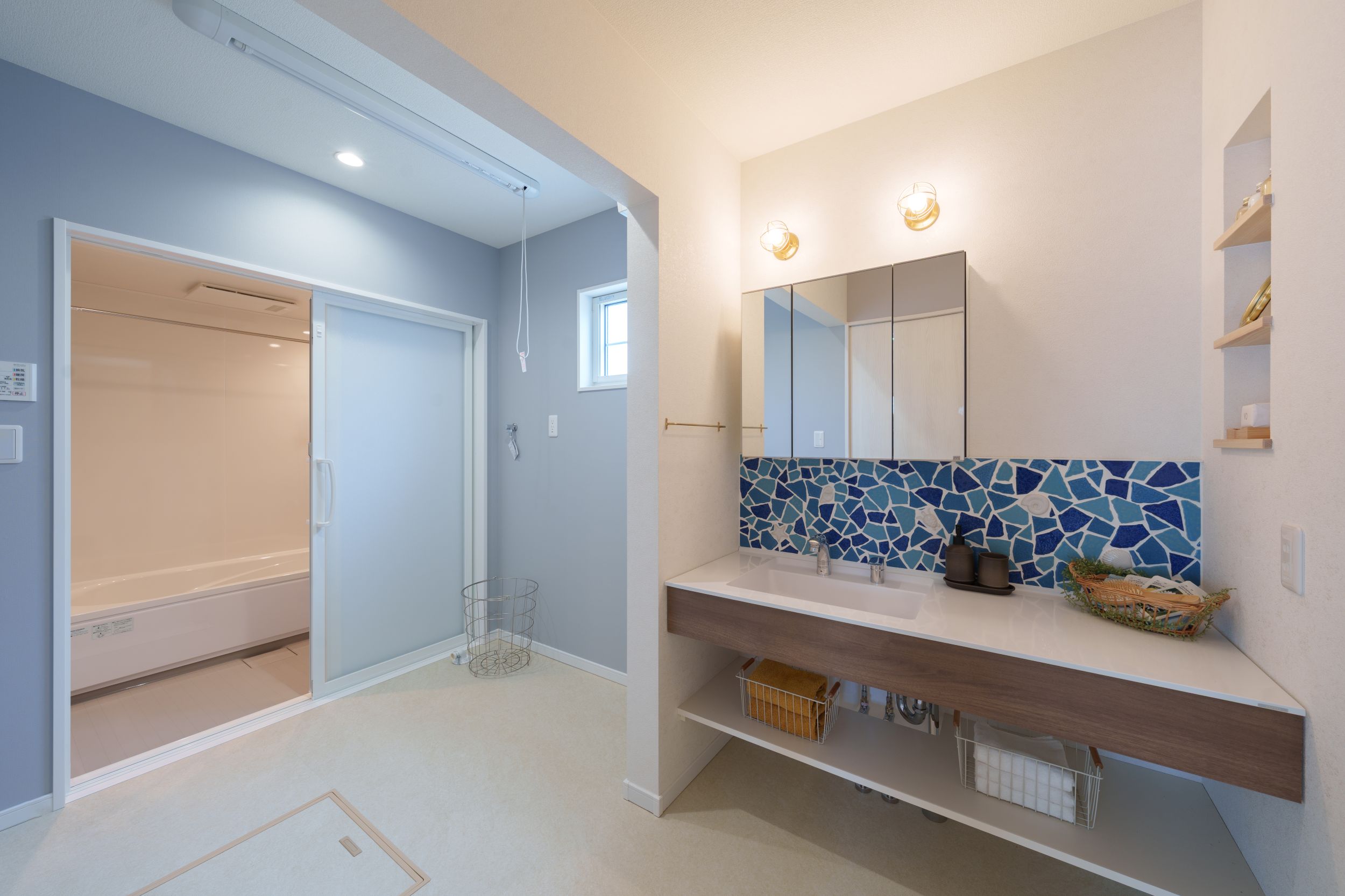 ディズニーが好きな奥様の想いを散りばめた住まい。イクスピアリをイメージした洗面タイルや、北欧風のキッチン壁紙など、好きなものに囲まれた空間に仕上がりました。暮らしやすい動線と、心地よさを大切にしたお家です。