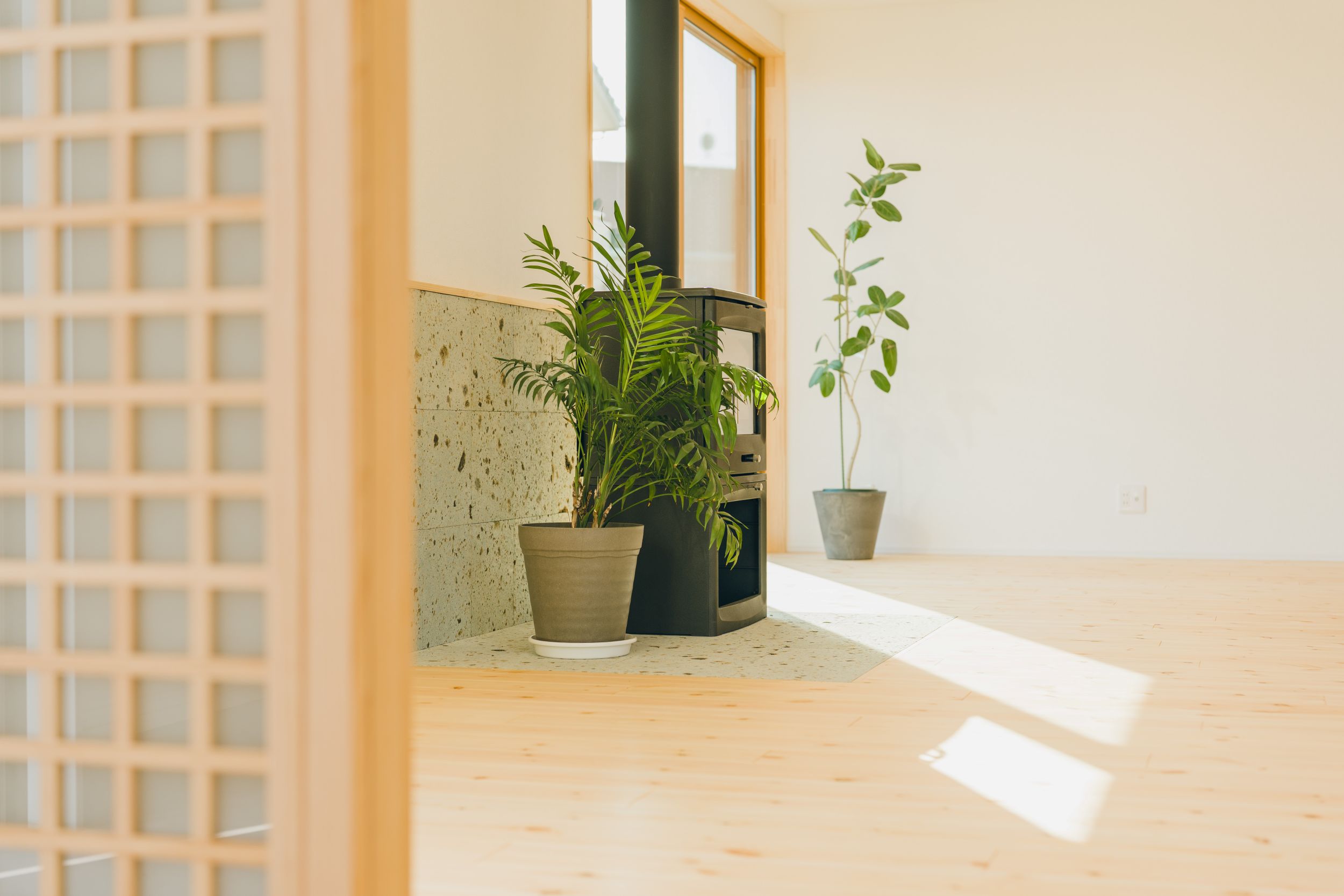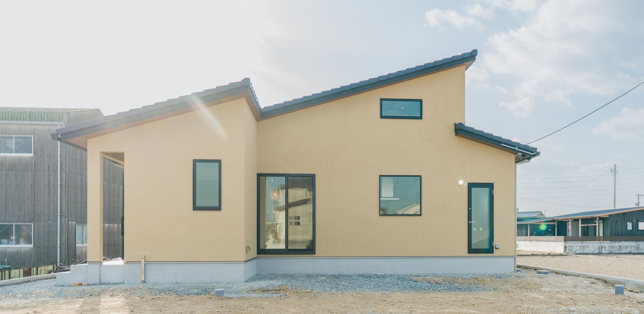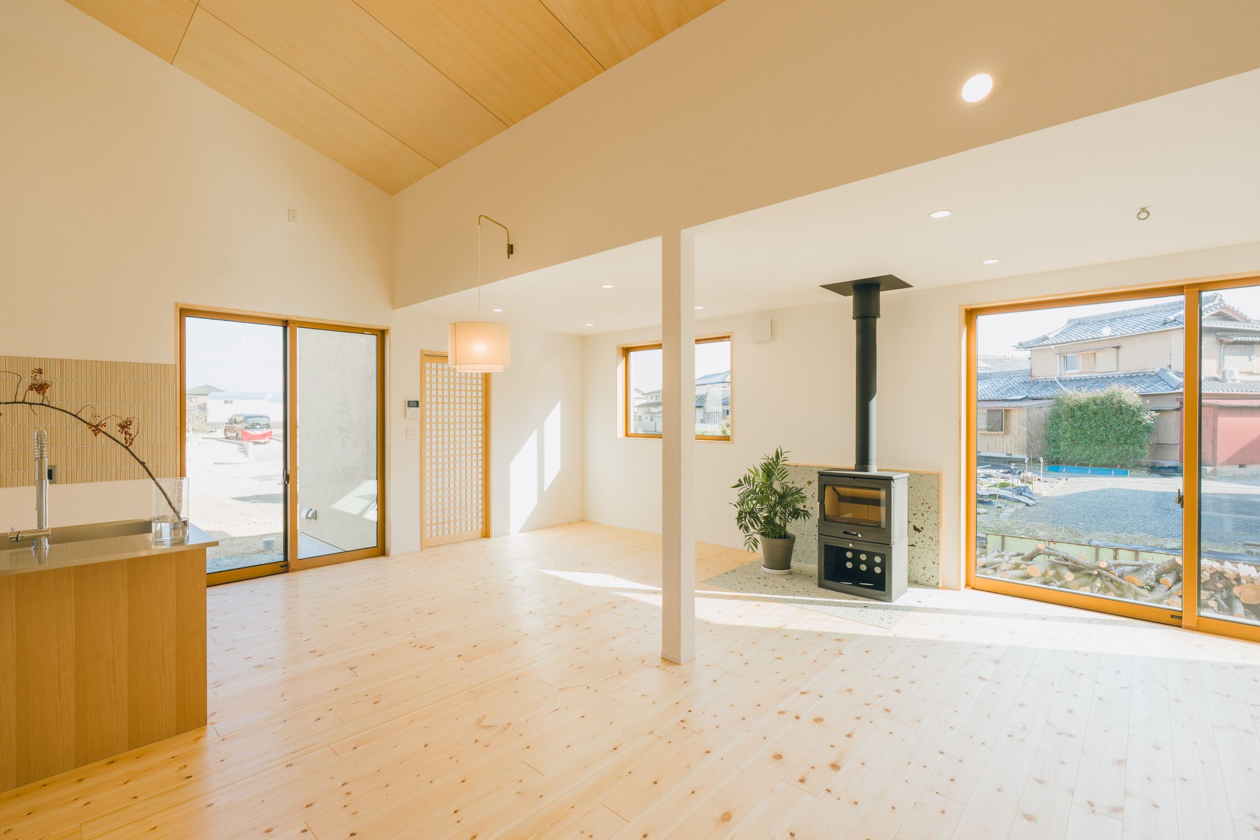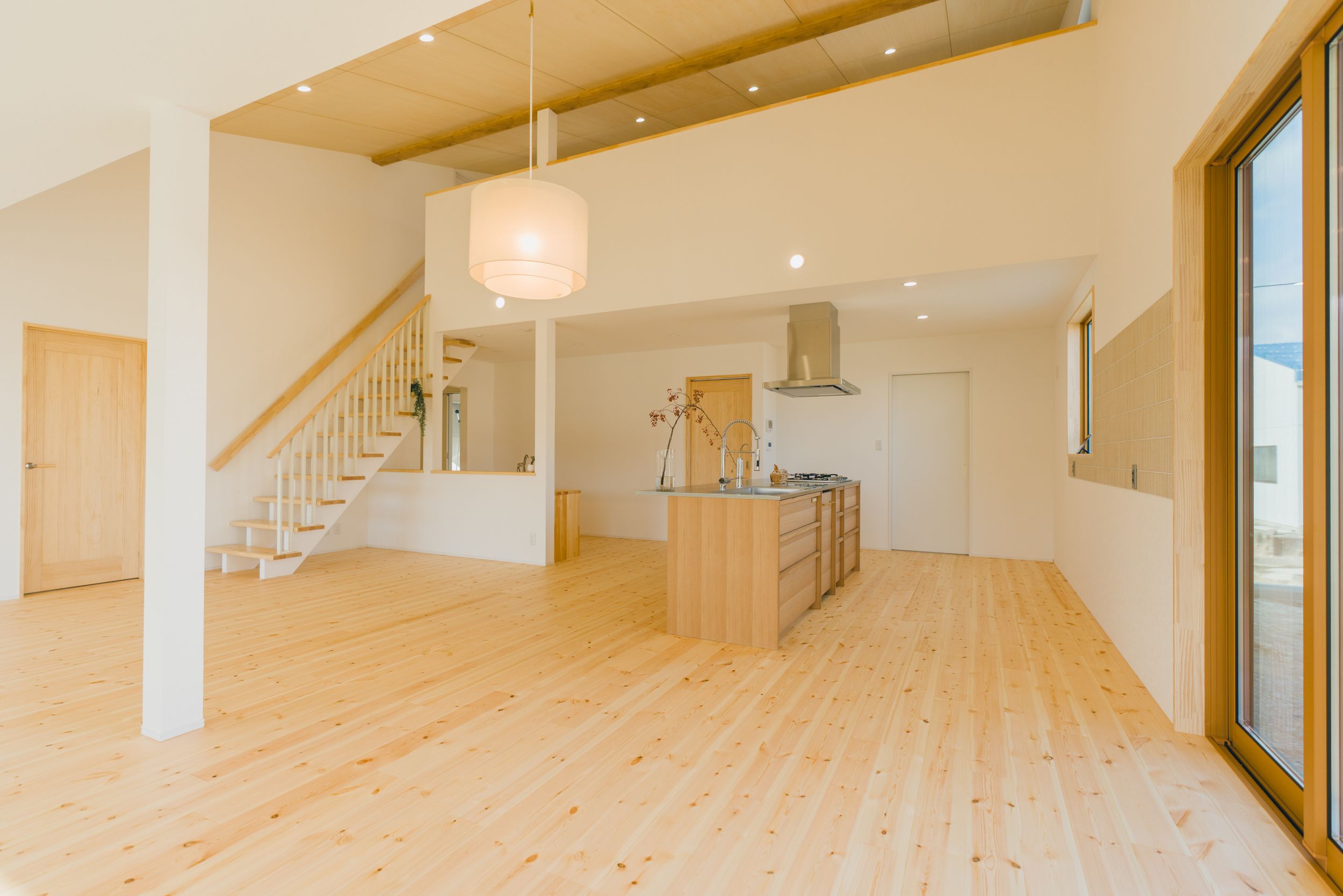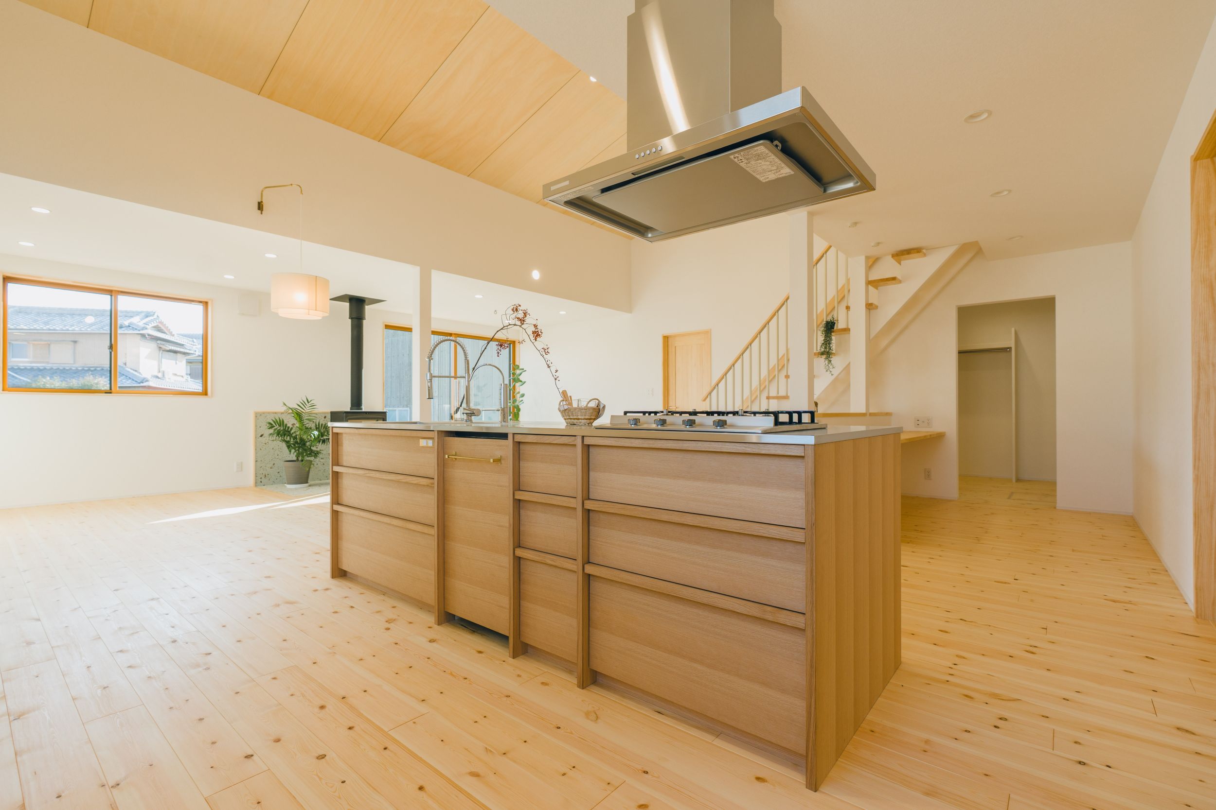150坪の敷地に建つ、家族のびのび暮らす住まい。35帖超のリビングには薪ストーブを設け、自然素材とオーダーキッチンにこだわりました。畑のある暮らしと使いやすいロフトも魅力です。